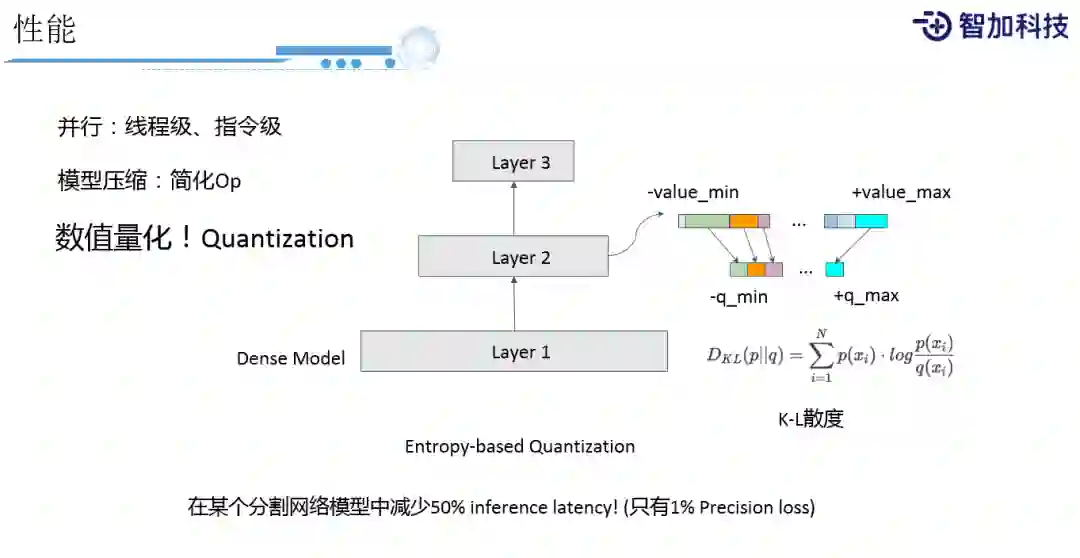 第二就是性能,我们在性能上除了会用一些特定的硬件,去做硬件加速。还包括软件上的一些传统方法,比如并行化这种优化,还有模型压缩的一些方法等等。还有一个很有效的一点,就是做数值量化,这里只是介绍一些我们的经验,因为大家知道我们在处理浮点数据,对GPU和CPU而言,它的性能要求还是非常高的,但实际上从整个数据的分布上来看,也不见得非得用这么高精度来表示数据。所以我们常用的方法就是量化,量化简单来做的话,可以做一个平均的量化,把一个0到100区间的数据,压缩到0到10区间,平均分成十份就可以了,这是最简的方法。但是,如果0到100区间中,这个数据的分布不是平均分布的话,这样做就会存在信息损失。所以我们会用基于Entropy的方法做量化,我们会看哪些数据,比较集中在多个区间上的,还是哪些数据,它在区间上是分布非常少的,这样在不同区间上,我们就可以有不同的在新的空间上的粒度,然后信息的损失,我们可以用K-L散度来计算出在老的区间上和新的区间上,它的熵的一个差值,去min、max差值来算出,这样一个新的区间应该怎样划分。图中是我们在数值量化上的一个应用,在我们的某个分割网络上的实践中,它能够减少50%的inference时间,而且精度上,在我们内部测只有1%精度的损失。这只是系统优化方法中的一点,还有很多环节需要优化。