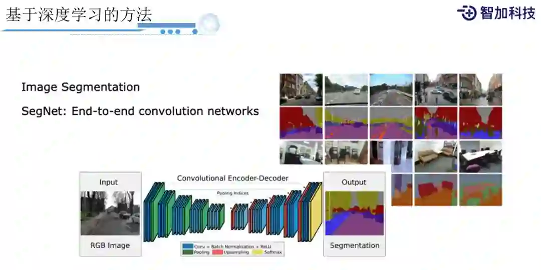 对于深度学习,业界已经有很多成熟的方法。这里很重要的就是图像分割,我们会给图像上每一个pixel(像素)都去预测它到底是什么样的分类,然后在打标的时候,也会标注图像上到底哪些是车道线,哪些是障碍物,哪些是天空,哪些是树木,等不同类型的标签。我们通过这样一个卷积的网络,类似Encoder-Decoder架构,先去做encoding到feature map,然后再deconvolution到一个大的feature map,然后再预测每个pixel跟ground truth之间分类的loss,比如用Softmax或者cross entropy都是可以的,最后我们就能学习出每个pixel是什么分类。但是光知道图像的分类可能还不够。
