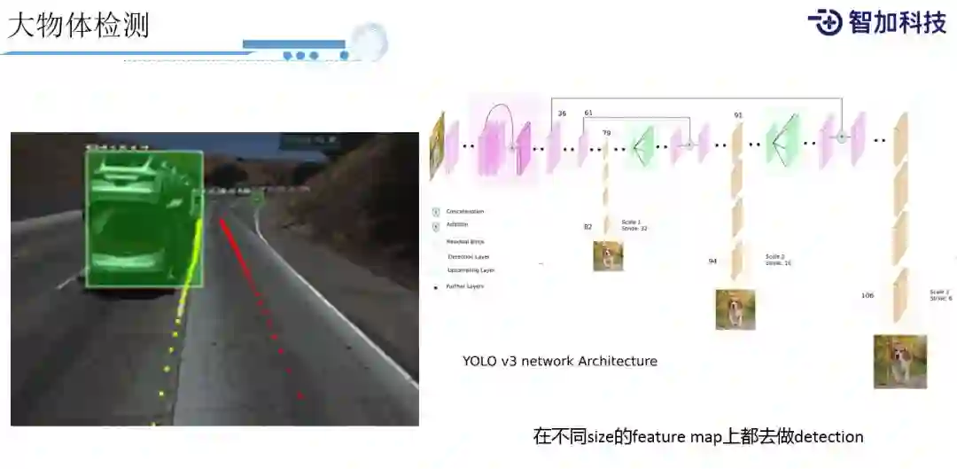 我们可以看下,我们采用这些方法后,实际中遇到的一些很有趣的问题。如左图,大家可以看到这是一个大车,是一个上下两层装载了很多小汽车的货车,从后面看它是两个小车,所以它到底是一个大车还是小车?这对于物体识别来说是一个很具有挑战性的例子,但我们还是能很稳定的识别出来。在这里,我们就借鉴了YOLO v3的思想,把feature map分成多个scale(级别),从小到大。将大物体在每个scale 的feature map都进行一次预测,这样大物体在小scale上能很好的预测出来。同时,它也兼顾了在大feature map上去预测小的分类物体。