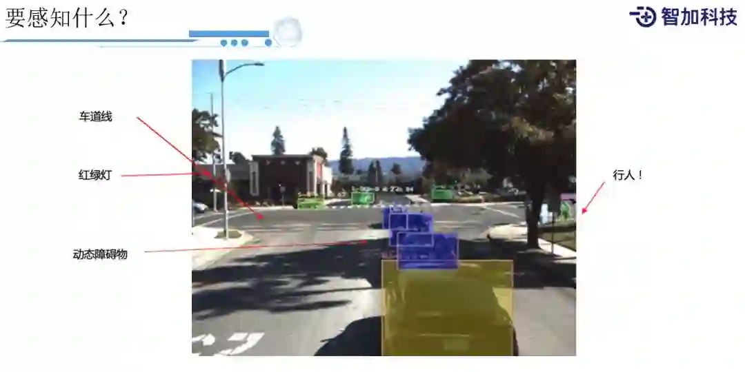 自动驾驶车辆除了能看到东西之外,关键还是需要理解它。只有理解它之后获得的信息,才对我们后续的处理有意义,所以需要识别,那么,对于自动驾驶而言,需要识别什么?显而易见,第一个是车道线,我们知道车道线才能知道怎么开;然后我们还需要知道红绿灯,以及非常重要一点,就是动态障碍物(如前面有什么车辆),这是非常重要的;还有就是行人(对于城区的自动驾驶是非常关键的)。对于智加的重卡自动驾驶中,最重要的还是车道线和动态障碍物,所以这两方面会重点进行介绍。