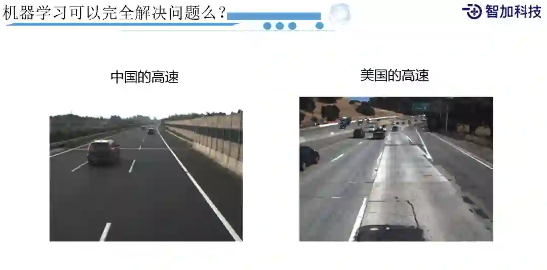 大家可以想像下,我们的机器学习技术可以解决所有问题么?大家可以看到左图是中国的高速,在中国的高速上,我们训练出来的模型,你觉得有可能在美国的高速上直接使用么?这看起来风险还是很大的,对不对?我们可以看到美国的基建跟中国比,还是落后很多的。所以说,这是机器学习的一个痛点,本质上讲它是数据驱动的一个方法,在中国的数据上积累的一些结果,在其它地方直接用还是很难的。所以关键的一点是,我们要学到数据里面的知识,或者它的方法,把这种方法泛化到别的场景上,才能适应各种场景。当然这还需要我们的AI技术走很长的路,在这之前,如果AI不知道怎样学出这种方法,还是需要我们人来教它这种方法,所以在我们系统的实践过程中,还会用一些人工的经验。