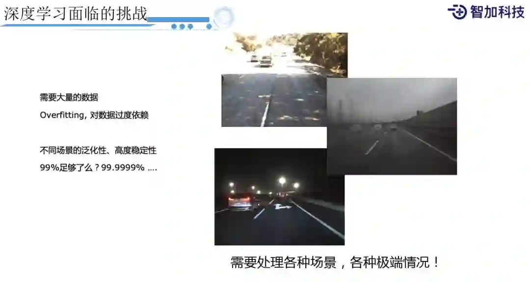 再看一些例子,我们要处理的各种corner case:像这种阳光非常强烈,曝光的情况,这也是美国那边的情况;然后是苏州这边,雨天的情况;还有在夜间当有强光或者是光线不足的情况,会有很多corner case。只依赖深度学习,还是很难解决这些长尾问题。