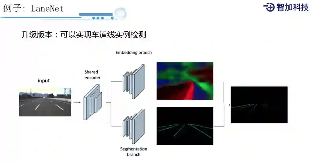 我们还需要进一步知道,到底图像上有几条车道线,哪些车道线是属于一条车道的?这里简单介绍下,我们会按照图中的做法,先把图像做encoding之后会分成两个branch,一个是Embedding branch,用来生成每个pixel的向量,这个向量可以告诉你它跟不同实例距离的分布,另外一个是Segmentation branch传统的分类网络。Embedding branch 向量计算出来之后和ground truth点的向量之间计算距离,这样就可以知道跟ground truth点之间有多近,和非ground truth点之间有多远,用这个距离当做loss,最后再结合分类的loss,得出最终的结果。