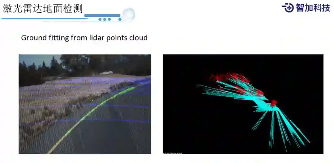 除了物体检测之外,激光雷达还有很重要一点,就是检测地面。因为激光雷达原理是遇到物体就会返回信号,所以信号大部分是地面(ground),当我们拿到地面信号之后就可以(因为它比较有规律)直接用一些传统方法来去做一个fitting,我们就可以fitting出平面,而且不见得是平面,它有可能是个曲面。比如图中这种匝道上的上坡,我们还是比较好的能够fitting出这个ground。地面预测出来之后,我们就能够把它给排除掉,帮助后面的detection做更好的处理。反过来,当地面识别出来之后,我们也可以把Object去掉,通过ground来辅助车道线做一些更好的处理,就能知道车道线的高度和深度是多少。