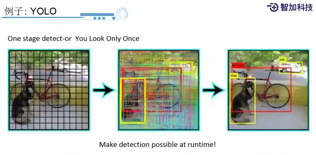 再进一步,业界又提出,可以一步就完成region预测和它的分类预测。比如YOLO,You Look Only Once这种方法,每个点会候选出若干个bounding box和sliding window,每个sliding window还有若干个要预测的分类,一步就能预测出分类和它对应的region box,让你的性能得到很大的提升。所以,现在很多业界主流都会用这样的方法。