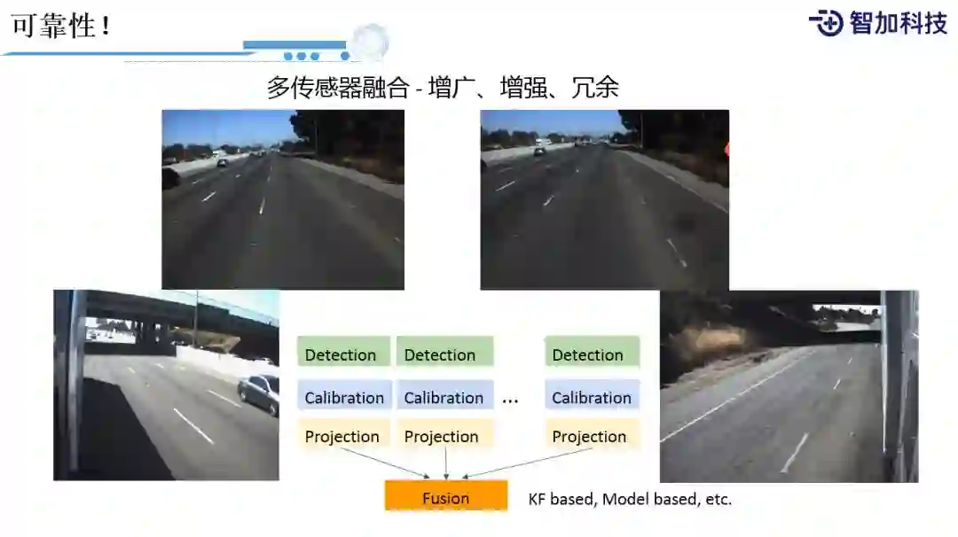 最后一点就是可靠性。刚才前面也介绍过,我们会有多个传感器,多个摄像头来提高它的冗余。有多个传感器之后,我们需要去想怎么把它们一起用起来,所以这里面我们还会有融合这样一个过程。比如,我们在测试车辆上装了前视的双目摄像头,还有后视的双目摄像头,只有当我们把多个传感器的数据映射到同一个空间上,并且把它们做一个融合处理,我们才能真正的把多个传感器的数据用起来。在这里面会有KF based的传统做法,也会有Model based的方法,受限于篇幅,这里就不做过多的展开了。