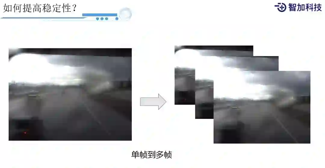 所以,怎么改进稳定性问题?这里有很多环节需要我们去改进,其中一个思路是从单帧过渡到多帧,更多的利用多帧历史上的数据,去提高算法和系统的稳定性。像这样的例子,我们在雨天摄像头都已经沾上雨滴了,已经很难看清前面的路和车,尤其是中间的车道线已经很难看清。但是在这种若隐若无车道线上,如果用多帧,还是能找出一些规律来,所以这也是我们很重要的、依赖的一个方向。