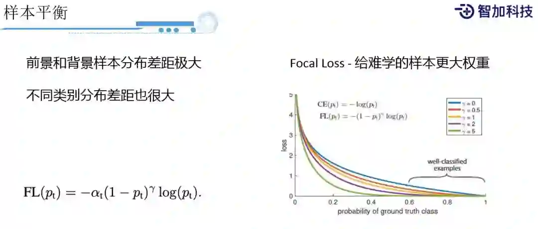 我们还会遇到一个问题,就是样本平衡问题。像刚才Faster RCNN里面,我们会遇到前景物体和背景物体样本分布差别很大,以及不同类别差别也很大。因为我们需要知道高速上行驶的到底是大车、小车,还是摩托车,对于不同类型的车,后续的策略可能是不一样的。由于不同类别差别很大,且天然的在样本上差别就很大,所以很难去平衡他它们。业界通常采用的方法,如Focal Loss会给这种比较难学的样本,增加它的权重,通过α和γ来控制权重比例。另外我们也可以直接计算不同类别的分布,然后用类别的分布当做一个控制Loss的权重。简单来讲,分布比较少的样本权重就会大一点。