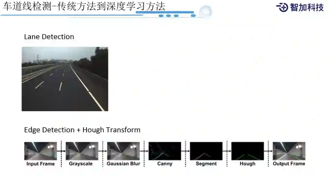 不同的光线;不同的车道线形状;车道线本身不同程度的破损;或者是它的一些噪音,尤其是一些障碍物的遮挡,如大量车辆遮挡的情况下,用传统方法很快就会遇到瓶颈,调参数是调不过来的。