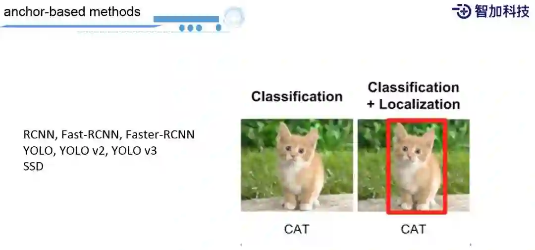 其中Faster RCNN是一个非常经典的做法,它是一个两阶段的算法,首先把图像通过卷积网络生成feature map,在feature map基础上预测出feature map上都有哪些region,region就相当于bounding box,预测出bounding box后, 再通过分类网络预测bounding box里面的图像,到底是什么样的类型。然后这两个网络会share之前的convolution network,所以在性能和效果上会达到一个比较好的tradeoff。同时,这里可以看到region proposal network是整个网里最关键的一个环节,它将整个网络划分成若干个grade,每个grade上的点生成固定的K个anchor boxes的候选,每个anchor box预测出它跟ground truth坐标的差距是多少,它是一个regression network。还有一个network是预测出物体到底是前景,还是背景,一个二分类网络。所以将这两个loss合并起来,当做整个学习的目标。所以,这也是为什么把这种方法叫做anchor-based,这里的anchor就是指region box。
