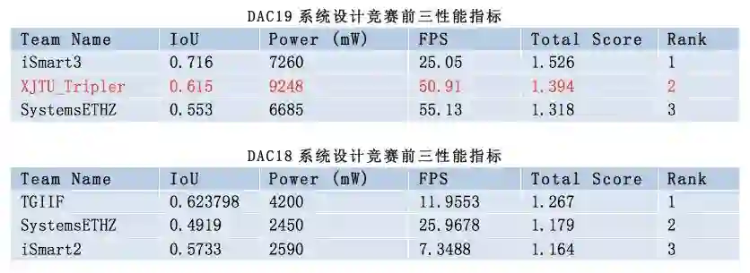 2019 年 6 月 5 日,由自动化设计顶级会议 Design Automation Conference(DAC'2019, CCF A 类会议)主办的第二届「低功耗目标检测系统设计挑战赛」于美国拉斯维加斯落下帷幕。该比赛由 Xilinx、大疆和英伟达赞助,针对比赛方给定的无人机视角的 12 类训练数据集(93.52K 张分辨率为 360x640 的图片,单目标标注)进行训练,在比赛方自有的 52.75K 张测试数据集上进行测试。最终检测精度 IoU (Intersection over Union) 高且能量消耗低者胜出。全球共有 58 支队伍注册了 FPGA 比赛任务,最终只有 11 支队伍提交了设计(完赛率 19%)。冠军是由 UIUC、IBM、Inspirit IoT 公司联合组队的 iSmart3(该队伍同时也是 GPU 赛道的冠军);亚军 XJTU-Tripler 来自西安交通大学人工智能与机器人研究所;季军来自 ETH Zurich 的 SystemsETHZ。