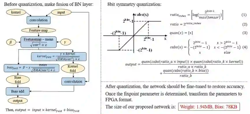 首先在 ImageNet 数据集上预训练一个标准的 ShuffleNet V2 分类网络。待模型收敛后,将其中的特征提取部分的参数迁移到 ShuffleDet 网络中。使用比赛方的训练集进行其他层的参数训练。为了适应 FPGA 的定点运算,待所有参数训练完成后,对所有参数进行量化操作。该团队将网络参数和 feature map 均量化为 8bit 定点。