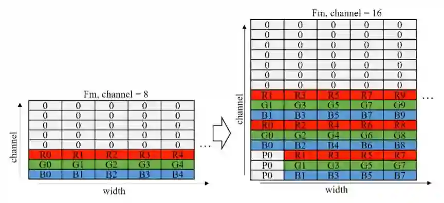 HiPU 一次并行计算 8 个输入 channel。然而网络第一层输入图像仅有 RGB 这 3 个通道,导致 HiPU 计算效率仅为 3/8。因此,我们团队针对输入图像设计了一个转换模块。如果 Conv1 的 kernel 的 width 为 3,则将输入图像的通道从 3 扩展到 9。最终使得第一层的处理效率从 0.38 提升到了 0.56,其转换示意图如图 8 所示。