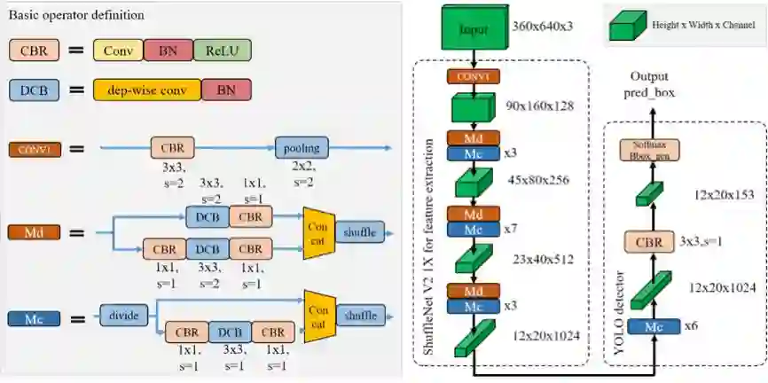 为满足移动端的检测实时性,该团队最终选定了 YOLO 作为基础检测框架,并自行定制网络 ShuffleDet。将其中的特征提取网络替换为轻量级的 ShuffleNet V2,其参数规模略大于 1X。