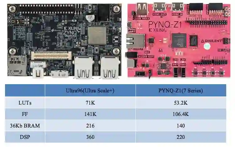 图 2:2018 和 2019 年比赛使用的不同 FPGA 开发板及核心芯片资源对比。Ultra96(左)PYNQ Z-1(右)