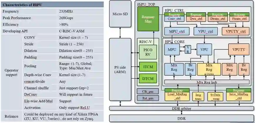 HiPU 是一款面向深度神经网络的通用加速器,完成了类似于英伟达的 NVDLA 与外部控制器的整合功能,并且在 FPGA 上的资源消耗与工作频率指标都有显著提升。由于西安交通大学人工智能与机器人研究所团队 (http://iair.xjtu.edu.cn) 主要面向专用集成电路 (AISC) 进行设计,其 FPGA 设计主要是进行功能的验证,因此,针对赛方提供的计算平台,我们需要对 HiPU 进行适当的裁剪,以适应 ZU3 的资源。图 3 所示为裁剪后的 HiPU 设计框图及其特性。在 Ultra96 板卡上,HiPU 可以在 233MHz 上运行,其峰值算力为 268Gops;采用 C/RISC-V 汇编作为编程接口,卷积效率平均在 80% 以上。