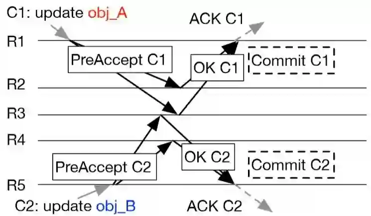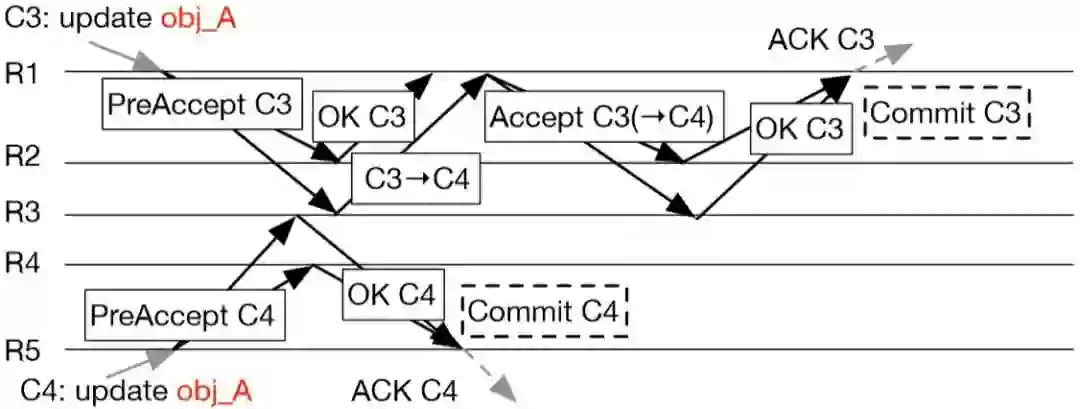 PreAccept阶段尝试将日志以及与其它日志之间的相对顺序达成一致,同时维护该日志与其它日志之间的冲突关系,如果运行完PreAccept阶段,没有发现该日志与其它并发提议的日志之间有冲突,则该日志以及与其它日志之间的相对顺序已经达成一致,直接发送异步的Commit消息提交;否则如果发现该日志与其它并发提议的日志之间有冲突,则日志之间的相对顺序还未达成一致,需要运行Accept阶段将冲突依赖关系达成多数派,再发送Commit消息提交。