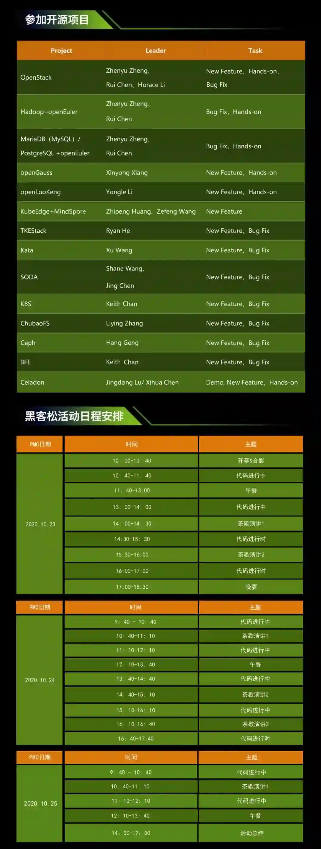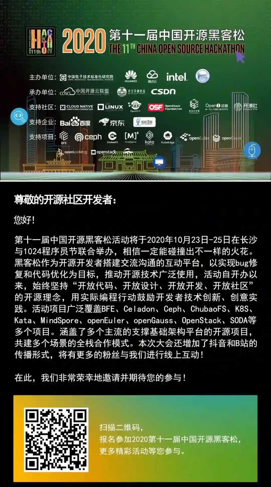 第十一届中国开源黑客松活动将于2020年10月23日-25日在长沙举办。黑客松活动将与1024程序员节相结合,相信一定能碰撞出不一样的火花。黑客松作为开源开发者搭建交流沟通的互动平台,以实现bug修复和代码优化为目标,推动开源技术广泛使用,活动自开办以来,始终坚持“开放代码、开放设计、开放开发、开放社区”的开源理念,用实际编程行动鼓励开发者技术创新、创意实践。活动项目广泛覆盖openEuler、 MindSpore、openGauss、OpenStack、K8S、SODA、Kata、Ceph、ChubaoFS、Celadon、BFE等多个项目,活动参与者超百人规模。涵盖了多个主流的支撑基础架构平台的开源项目,共建多个场景的全栈合作模式。本次大会还增加了抖音和B站的传播形式,将有更多的粉丝与我们进行线上互动!
