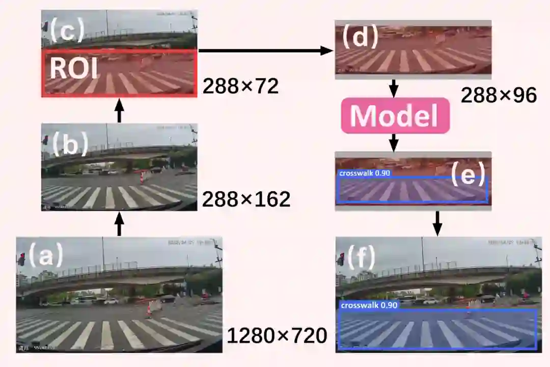 在复杂场景和有限计算能力下实现实时、鲁棒的斑马线(人行横道)检测是当前智能交通管理系统(ITMS)的重要难点之一。有限的边缘计算能力和多云、晴天、雨天、雾天和夜间等真实复杂的场景同时对这项任务提出了挑战。本研究提出基于改进YOLOv5的人行横道检测网络(CDNet),实现车载摄像头视觉下快速准确的人行横道检测,并在Jetson nano设备上实现实时检测。强大的卷积神经网络特征提取器用于处理复杂环境,网络中嵌入了squeeze-and-excitation(SE)注意力机制模块,使用负样本训练(NST)方法提高准确率,利用感兴趣区域(ROI)算法进一步提高检测速度,提出了一种新的滑动感受野短时向量记忆(SSVM)算法来提高车辆交叉行为检测精度,使用合成雾增强算法允许模型适应有雾的场景。最后,在 Jetson nano 上以 33.1 FPS 的检测速度,我们在上述复杂场景中获得了 94.83% 的平均 F1 分数。对于晴天和阴天等更好的天气条件,F1 分数超过 98%。该工作为人工神经网络算法优化方法在边缘计算设备上的具体应用提供了参考,发布的模型为智能交通管理系统提供了算法支持。