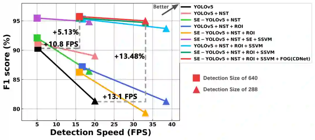 与原生YOLOv5相比,检测尺寸为640时,CDNet 在 Jetson nano 上提高了5.13%的F1分数和10.7FPS的速度, 检测尺寸为288时,提升为13.38%的F1分数和13.1FPS。