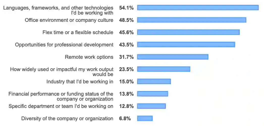 让受访者去权重工作中重要的因素时,有54.1%的人认为自己使用的语言,框架和技术很重要。