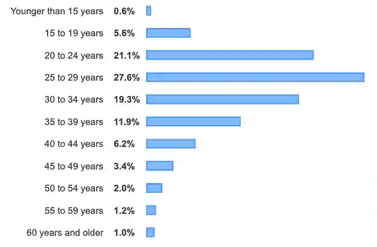 2019年,Stack Overflow对全球近90,000名开发人员进行了调查(本次调查对象不包括中国),调查显示,国外20-34岁程序员人数占比最大,35岁以上的程序员占总数的25.7%。2018年占24.7%,相比之下,35岁的程序员人数在增加。