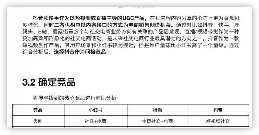 上图,A同学将小红书定位为社交产品,所以最终选定的竞品为:微博和知乎;下图,B同学将小红书定位为 社交+电商型产品,所以选取的竞品是得物,并将抖音作为了间接竞品。