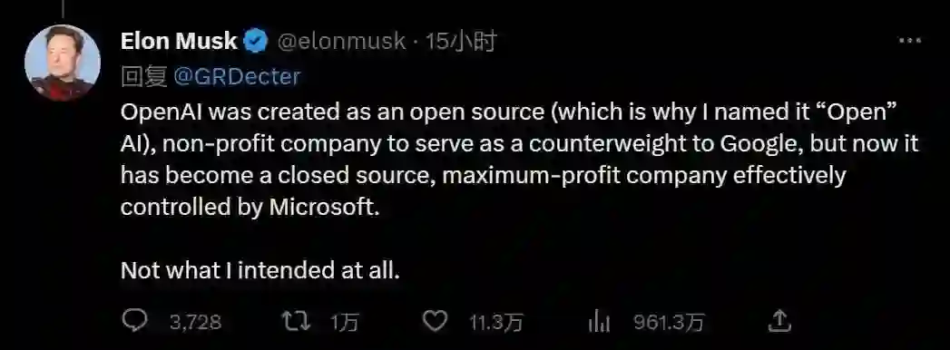 2 月 17 日,他在推特上写道:「OpenAI 是作为一个开源、非营利性质的公司创建的(这就是为什么我将其命名为『Open』AI),以作为对抗谷歌的力量,但现在它已经成为一个闭源,微软有效控制的利润最大化的营利性公司。」