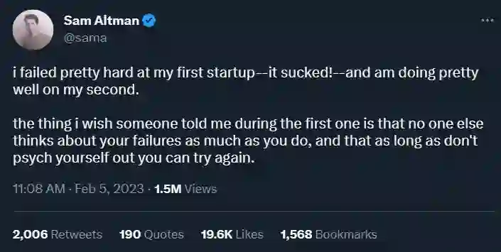 他上个月在推特上写道:「我在第一次创业时失败得一塌糊涂 —— 太糟糕了!而在第二次创业中,我做得很好。我希望有人在第一次失败时告诉我的事情是,没有人会像你那样思考你自己的失败,只要不让自己丧失信心,你就可以再试一次。」