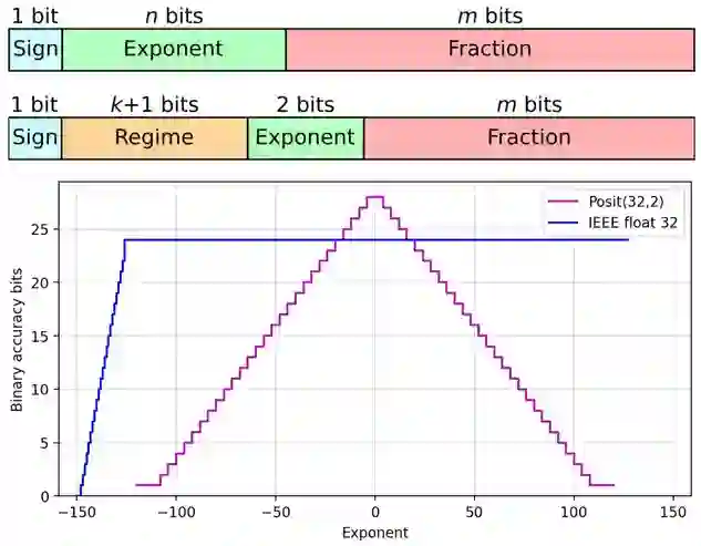 Posits 保留了浮点数的所有组件,但添加了一个额外的「regime」部分,即指数的指数。这个 regime 的奇妙之处在于它的 bit 长度可以变化。对于小数,regime 可能只需要 2 个 bit,为尾数提供更高精度。这允许在 1 和 - 1 附近的最佳位置实现更高的准确率。