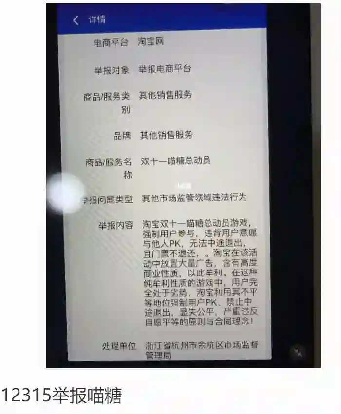 小红书上甚至有网友截图表示自己已经把喵糖游戏举报,举报内容显示:在这种纯牟利性质的游戏中,用户完全处于劣势,无法中途退出,严重违反自愿平等的原则理念。