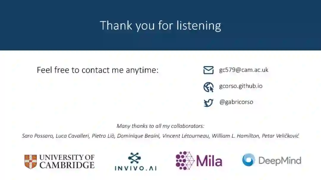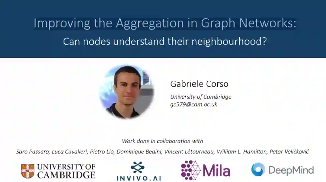 图神经网络已被证明是对图结构数据的不同预测任务的有效模型。本次演讲将结合主邻域聚合(NeurIPS 2020)和有向图网络(在NeurIPS 2020的DiffGeo4DL研讨会上发言)的研究。我们将检查图神经网络的表达能力,显示当涉及到连续特征空间和定向核时的局限性。这些都将促使GNN的聚合方法得到改进,从而使我们能够全面泛化CNN。来自分子化学和计算机视觉基准的实证结果将验证我们的发现。