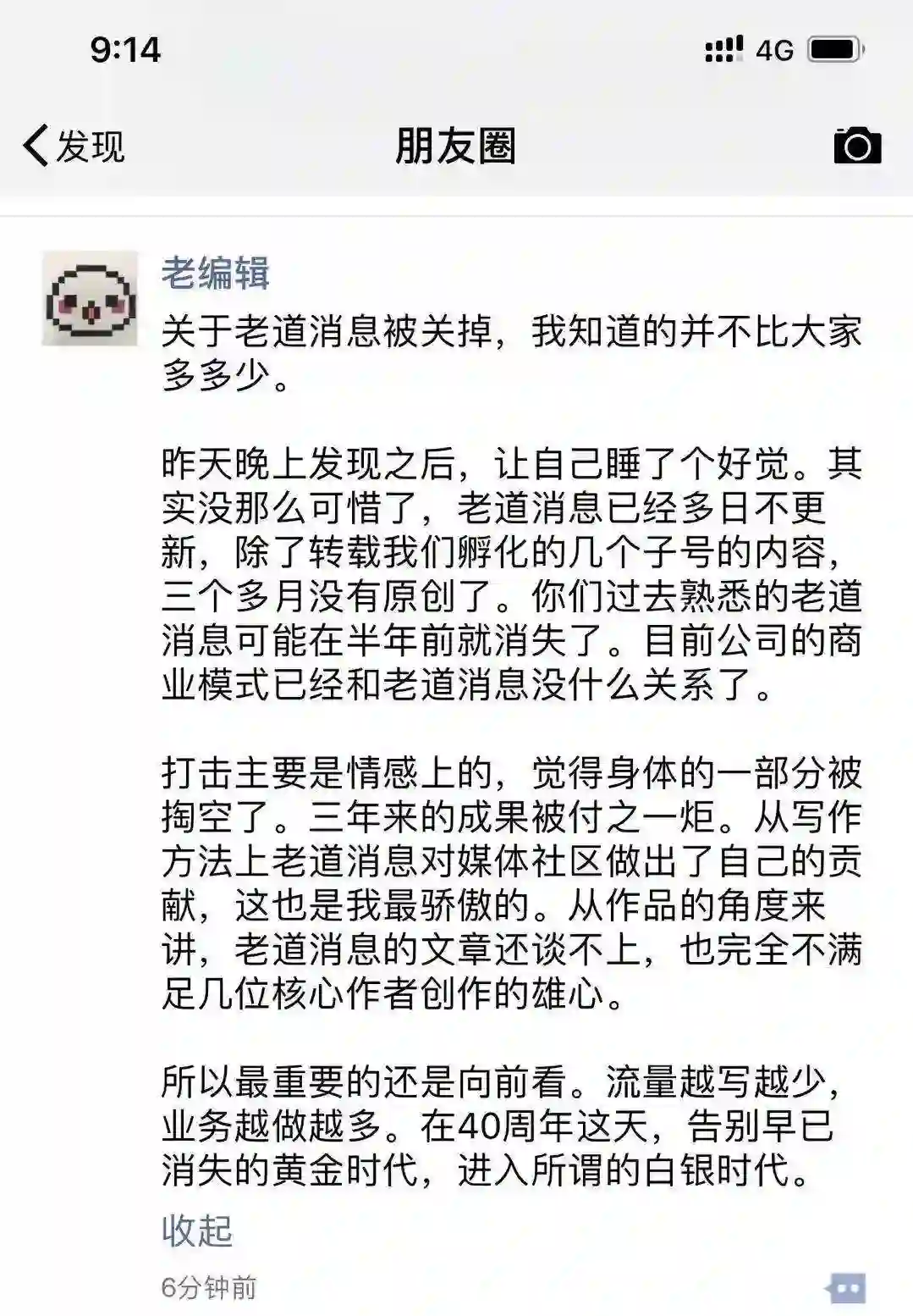 今日上午,「老道消息」创始人张豫宏(笔名:老编辑)发朋友圈称:目前公司的商业模式已经和老道消息没什么关系了……最重要的是向前看,流量越写越少,业务越做越多。