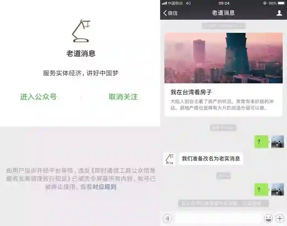 新榜讯 昨天(12月18日),公众号「老道消息」被封,公众号页面显示:由用户投诉并经平台审核,违反《即时通信工具公众信息服务发展管理暂行规定》已被责令屏蔽所有内容,账号已被停止使用。