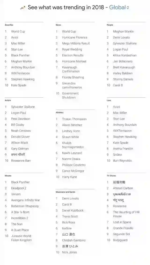 据悉,谷歌的排行方式不是按总搜索量计算,而是根据特定主题中2017年至2018年的兴趣增加。相较于去年谷歌热搜榜,今年的榜单中关于新技术、科技的词语极少。去年的榜单中苹果的两款新手机iPhone 8和iPhone X就占据二、三位,而今年的热搜榜则是被娱乐和体育占领。
