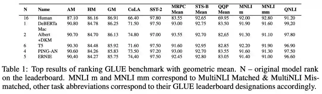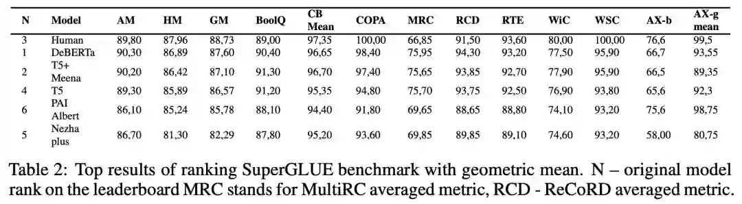 这篇“神论文”是 《How not to Lie with a Benchmark: Rearranging NLP Leaderboards》 ,论文的大致内容是说目前很多排行榜算平均都用算术平均,而它认为几何平均与调和平均更加合理。最关键是它还对GLUE、SuperGLUE等榜单上的模型用几何平均和调和平均重新算了一下排名,结果发现那些超过人类的模型在新的平均方案下都没超过人类了。