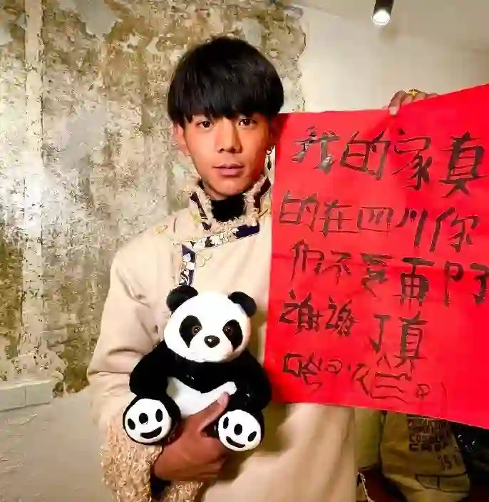为了重申自己“属于”四川理塘县的,丁真手抱熊猫,用红纸黑字写下“我的家真的在四川,你们不要再P了”的大字。