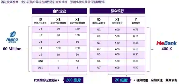 我们来看一个微众银行和合作伙伴公司的案例。微众的特点是有很多用户Y,我们把数据集分为X和Y,X是用户的特征和行为,Y是最后的结论,我们在银行的结论是信用逾期是否发生,这是逾期概率,合作的伙伴企业可能是互联网企业或者是卖车的或者卖保险,不一定有结论数据Y,但是它有很多行为信息X。