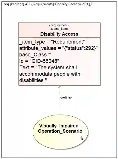 引用连接更简单,因为信息没有复制。在Syndeia中,这样的连接可以检查是否有新版本的Jama需求提交。模型变换连接则可以提供更多的建模灵活性,SysML需求可以通过标准关系(例如Satisfy、Verify和Refine依赖)链接到多个其他SysML元素。图4展示一张SysML行为图,描述了视力障碍乘客使用AV的场景。图5展示了SysML模型使用这个场景,通过标准Refine依赖来精化或澄清需求。如果SysML模型显式包括需求,包括需求验证和分解在内的其他任务可以被简化。