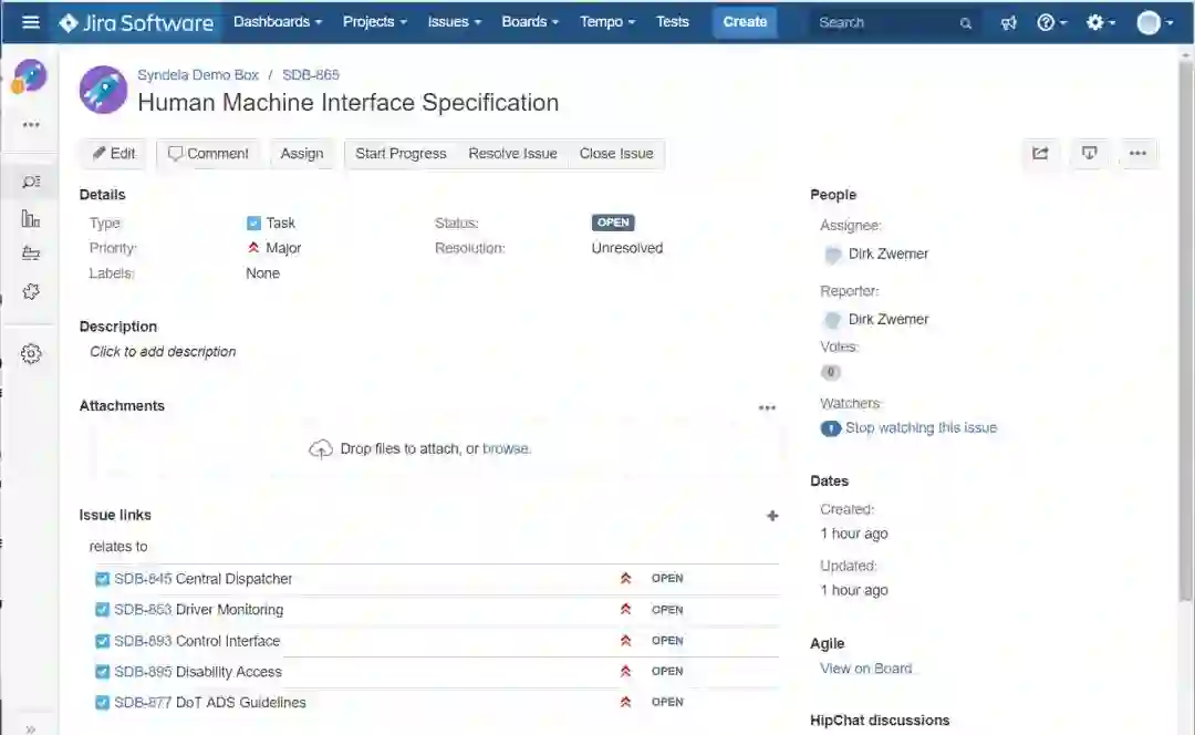 再次使用Syndeia,我们使用SysML需求结构生成JIRA条目的集合,每条需求一条。图8展示了中层的需求规约。每条需求的JIRA条目可以用于项目管理,例如跟踪状态、安排进度和分配人员。本例中使用了引用连接,在SysML需求和JIRA条目之间没有共同的属性。然而,连接允许系统工程师在web浏览器中直接打开SysML模型元素或元素符号的JIRA条目,并为Jama仓储提供间接的反向链接。使用这些连接,我们就完成了图2中TSM架构左侧的工作。