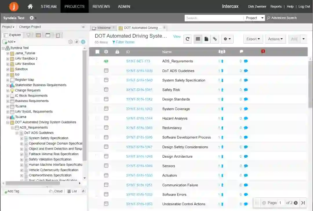 我们假设需求一开始在需求管理工具中生成。图6展示了创建自US DoT(美国交通部)报告, "Automated Driving System 2.0: A Vision for Safety" (September 2017)的部分需求列表。在Jama中被捕获为多层需求模型。每条捕获进Jama的需求都有Name(名称), ID, Description(描述)和其他属性。图7展示了Jama web浏览器中的需求。注意:DoT报告是建议指南的集合,不是强制的需求,此处只是为了展示。