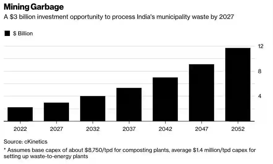 垃圾回收大有钱途:到2027年,印度的城市垃圾处理设施投资将达到30亿美元(假设堆肥厂的基础资本支出约为8750美元/日,垃圾焚烧发电厂平均资本支出为140万美元/日)