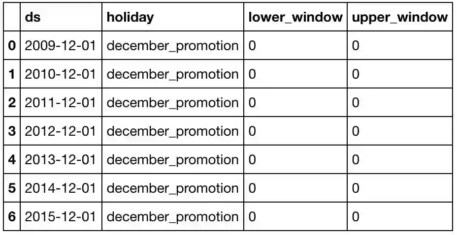 将lower_window和upper_window的值设置为零,以表明我们不希望Prophet考虑任何其他月份列表。