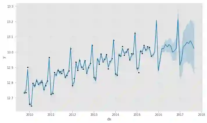 然后创建一组新数据(predict_df),只包含“future data”。然后,它根据预测数据创建一个带有置信带的图。