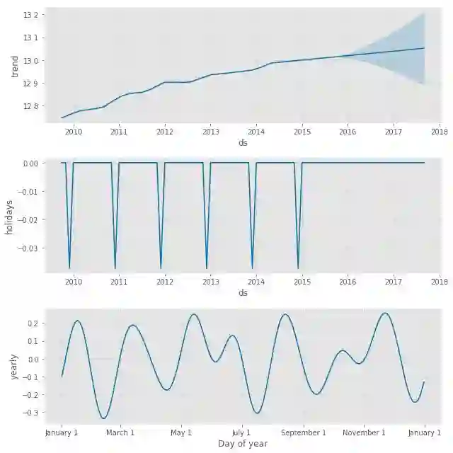 另外,Prophet的component是十分重要,因为它允许你查看模型的趋势和季节性等等: