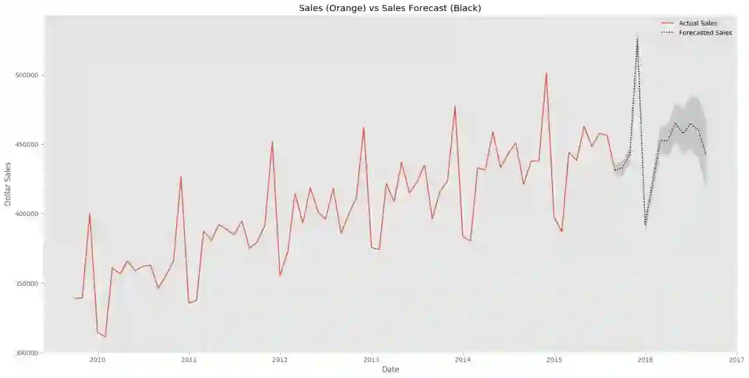 ax1.set_title('Sales (Orange) vs Sales Forecast (Black)')