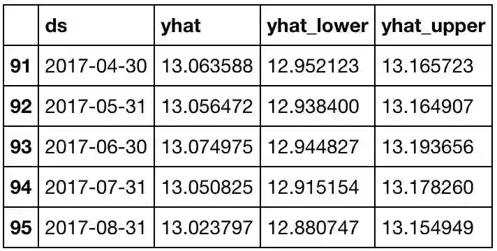 首先,我们需要将数据进行适当的组合和索引,以便开始绘图。我们只对来预测数据集的“yhat”、“yhat_lower”和“yhat_upper”列作分析。