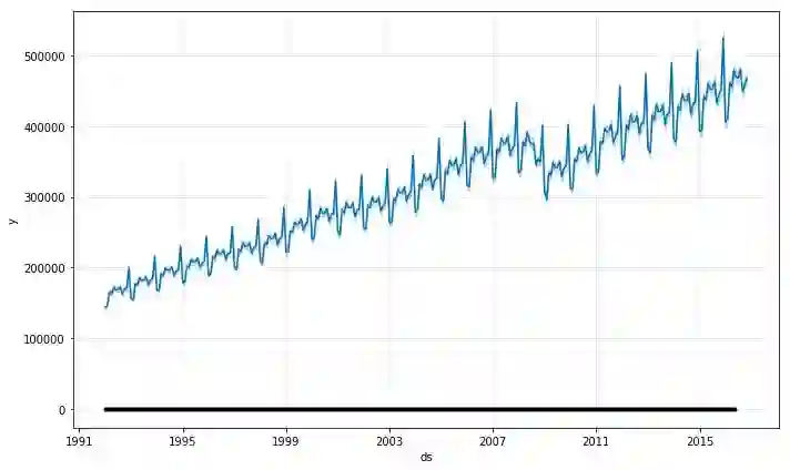 上面这张图看着怪怪的。我们把原始数据绘制在预测图上,黑点(图表底部)是我们的原始数据。为了让这个整个图表更有参考意义,我们需要把原始的y数据点绘制在这个图表上。为此,只需将sales_df dataframe中的“y_orig”列重命名为“y”即可绘制正确的数据。