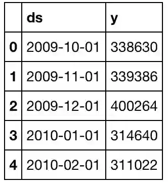 注意Dataframe的格式。需要有一个包含datetime字段的'ds'列和一个包含我们想要建模/预测的值的'y'列。