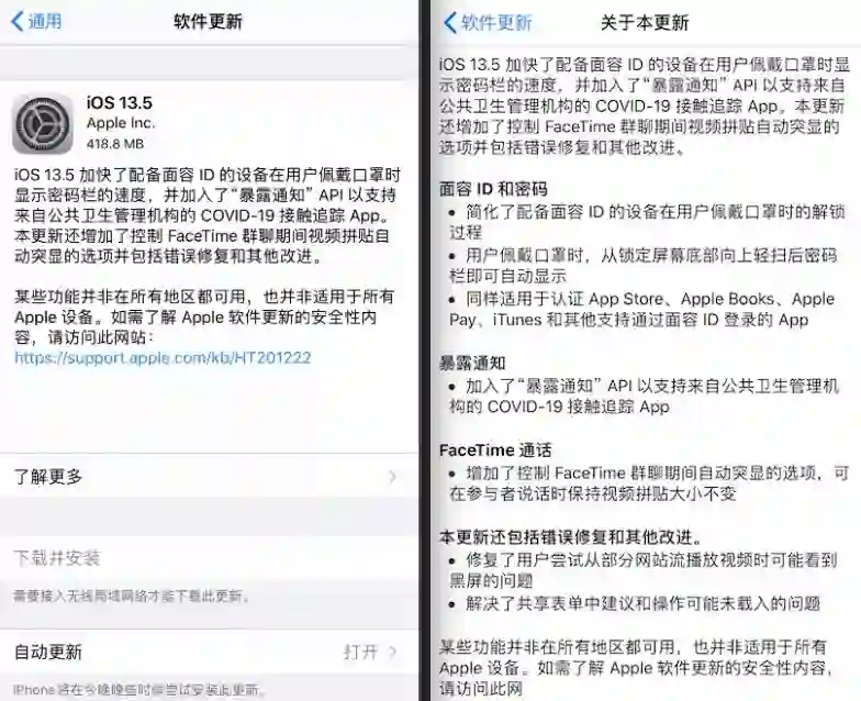 苹果发布iOS 13.5正式版:优化戴口罩解锁手机的方式